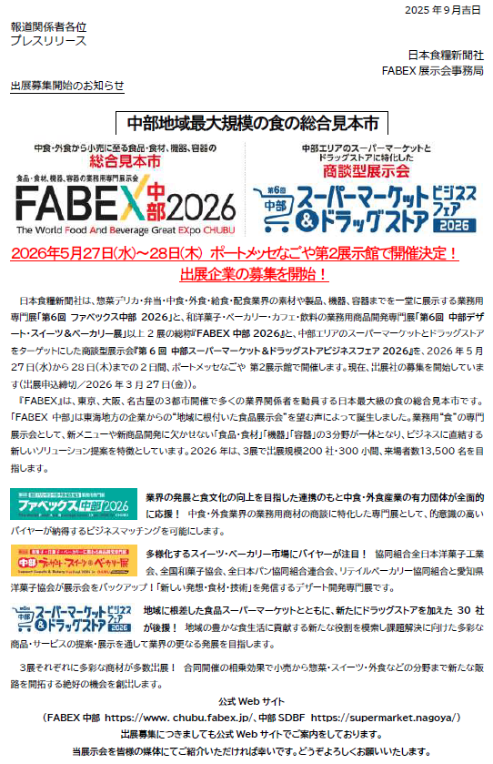 「FABEX中部2026」プレスリリース2025.9月号を掲載しました。2026年5月開催が決定し、現在出展...